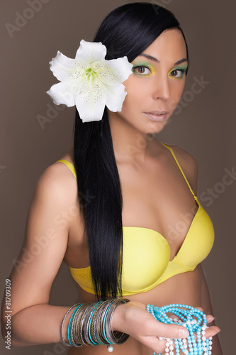 Beautiful Young Hawaiian Woman With Flower Sexy Girl In Bikini