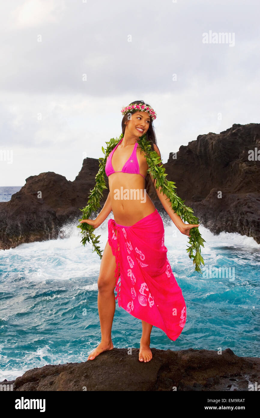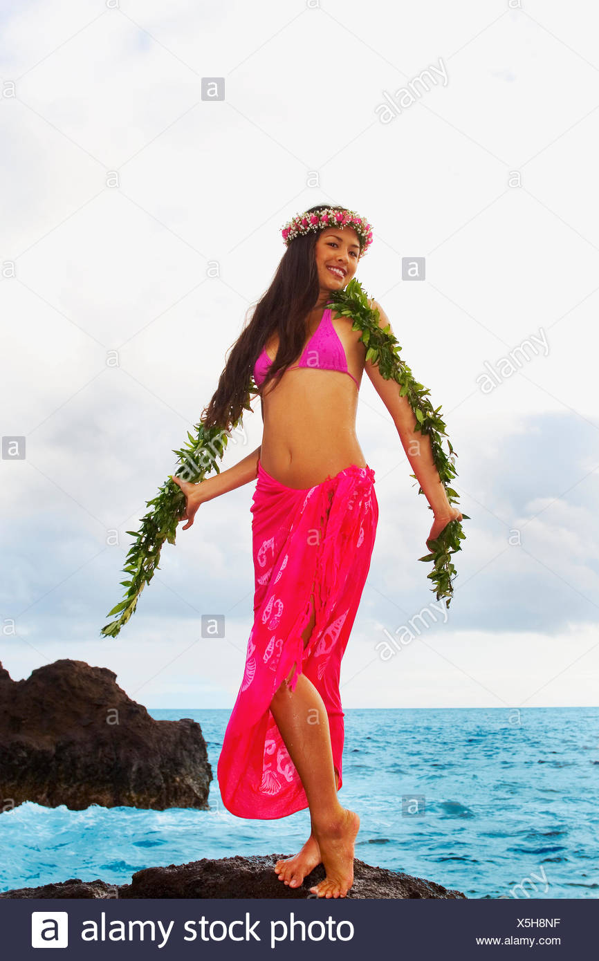Beautiful Hawaiian Woman Portrait Dancing On The Beach Stock