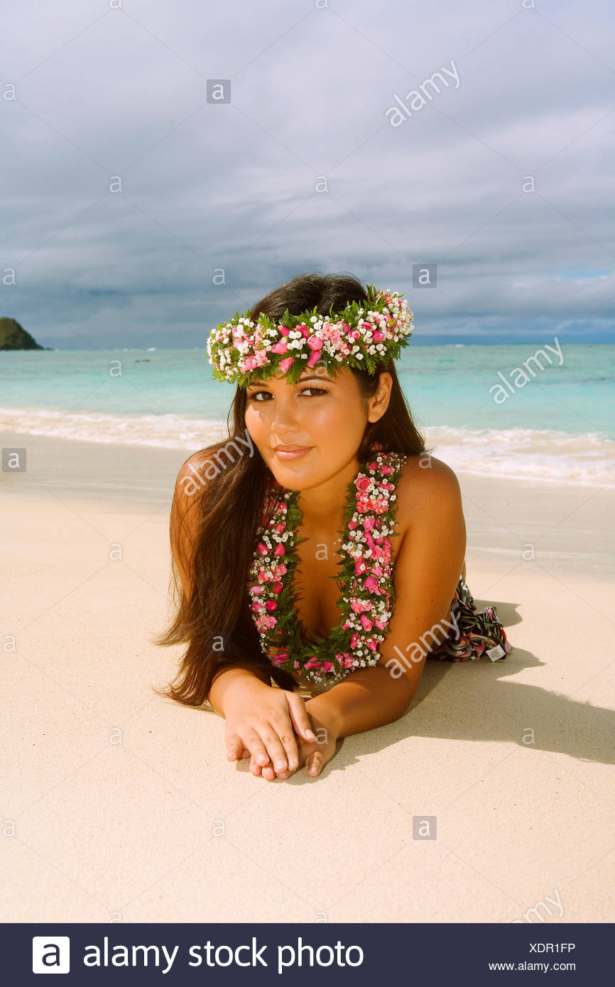 Hawaii Oahu Lanikai Beautiful Hawaiian Girl In Haku And Lei