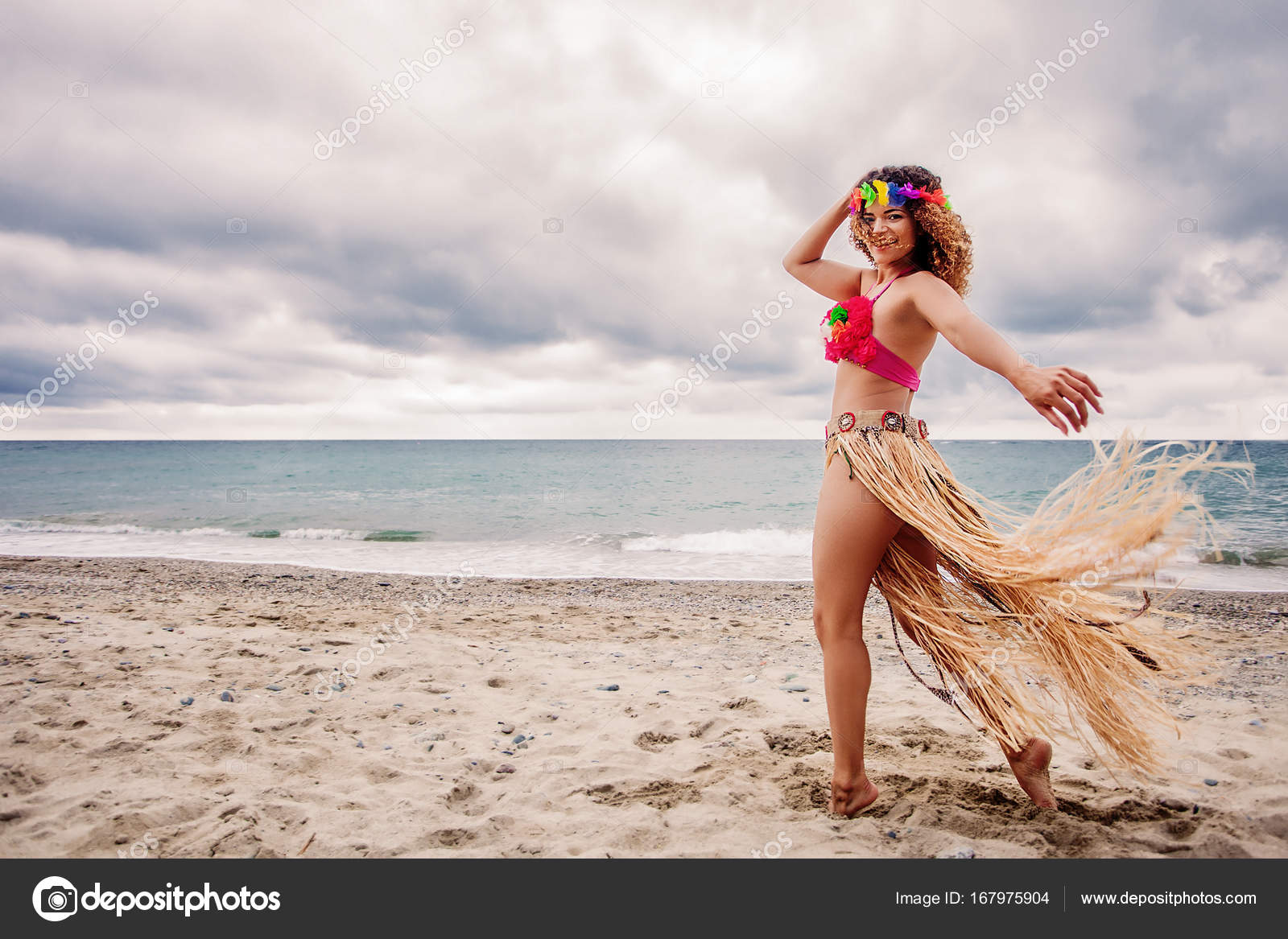 Beautiful And Happy Hawaiian Woman Dancing On The Beach Stock