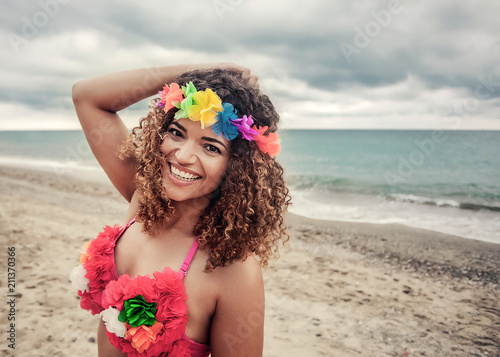 Beautiful And Happy Hawaiian Woman Portrait On The Beach Stock